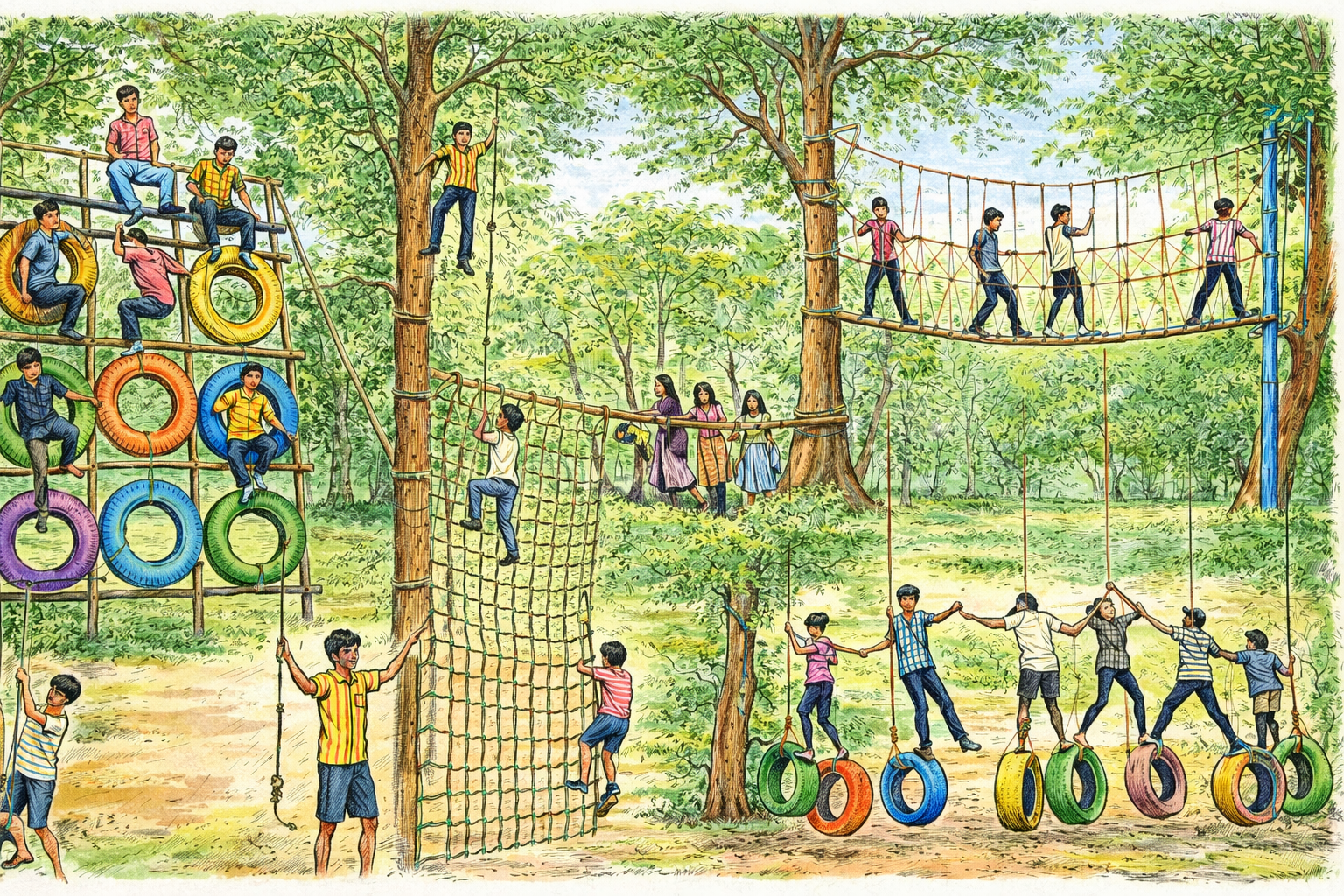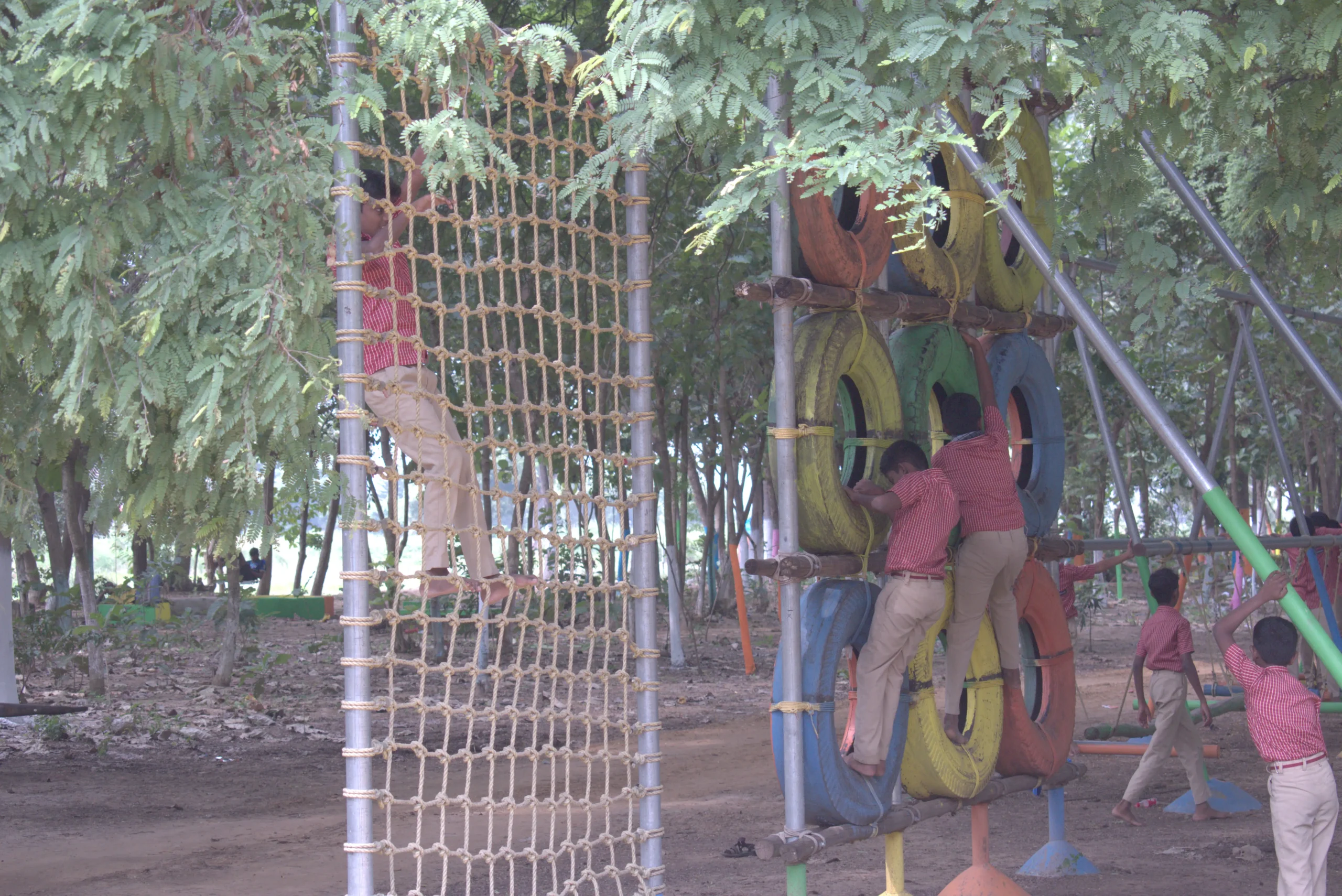 Our Adventure Activity Zone is more than just play — it is a dynamic outdoor training ground designed to develop strength, coordination, courage, and teamwork in a natural environment. Surrounded by trees and fresh air, each activity combines physical challenge with pure excitement.