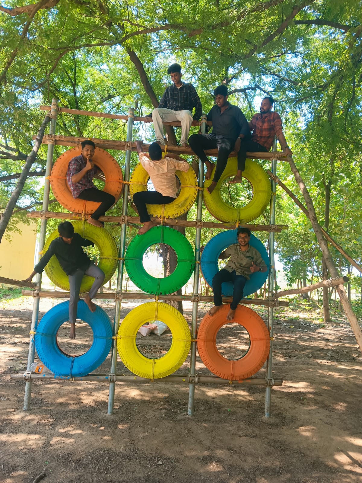 A vibrant vertical climbing structure built from eco-repurposed tyres arranged in a secure grid formation. Participants climb upward using tyre openings as stepping and gripping points, testing both physical strength and strategic movement.